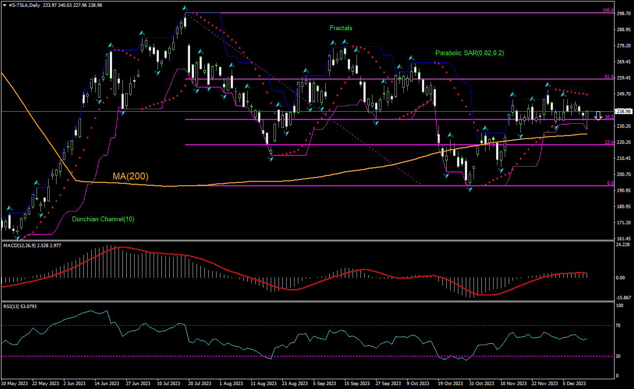 The technical analysis of the Tesla stock price chart on daily timeframe shows #S-TSLA,Daily is retracing down toward the 200-day moving average MA(200) after rebounding from seven-month low it hit six weeks ago. We believe the bearish momentum will continue after the price breaches below the lower boundary of Donchian channel at 227.96. This level can be used as an entry point for placing a pending order to selly. The stop loss can be placed above the fractal low at 246.39. After placing the order, the stop loss is to be moved every day to the next fractal high indicator, following Parabolic signals. Thus, we are changing the expected profit/loss ratio to the breakeven point. If the price meets the stop loss level (246.39) without reaching the order (227.96), we recommend cancelling the order: the market has undergone internal changes which were not taken into account.